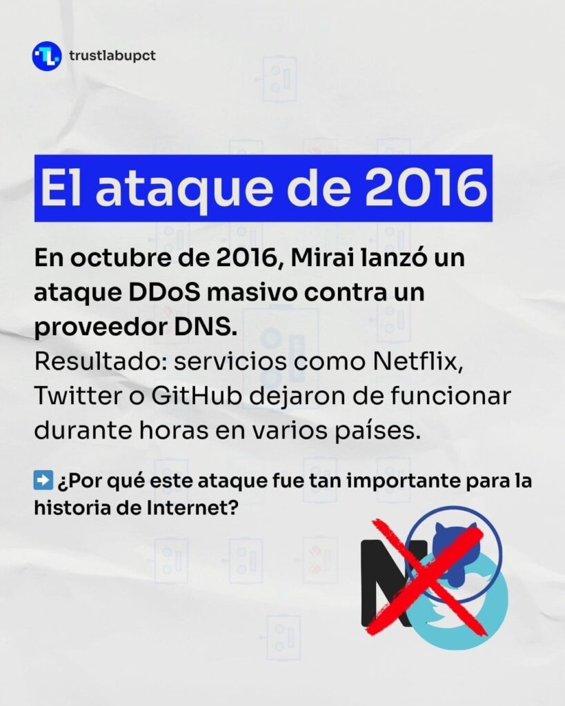 Mirai Botnet fue una red de dispositivos conectados a Internet —principalmente IoT— infectados por un malware que los convertía en “bots” controlados remotamente. El objetivo era lanzar ataques DDoS (Distributed Denial of Service) a gran escala: miles o millones de dispositivos enviando tráfico al mismo tiempo hasta saturar la capacidad de la víctima. El rasgo diferencial no estuvo solo en el tamaño, sino en la superficie de ataque: cámaras IP, routers y DVR domésticos con configuraciones débiles, expuestos a Internet y, en muchos casos, con contraseñas por defecto.